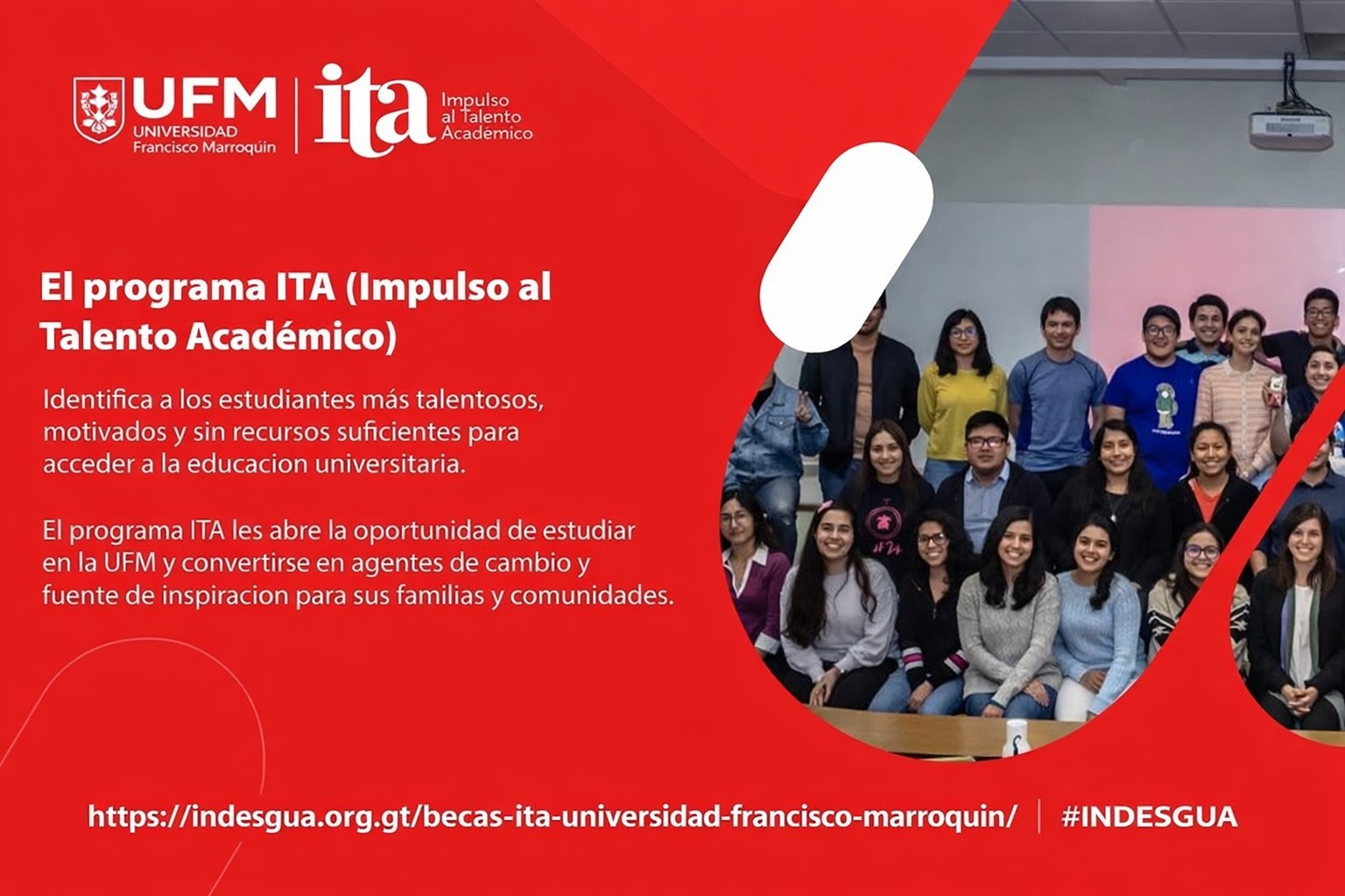 El Programa de Becas ITA (Impulso al Talento Académico) identifica a los estudiantes más talentosos, más motivados y de un nivel socioeconómico bajo, para brindarles la oportunidad de obtener toda la ayuda necesaria para cursar estudios superiores en la Universidad Francisco Marroquín (UFM)