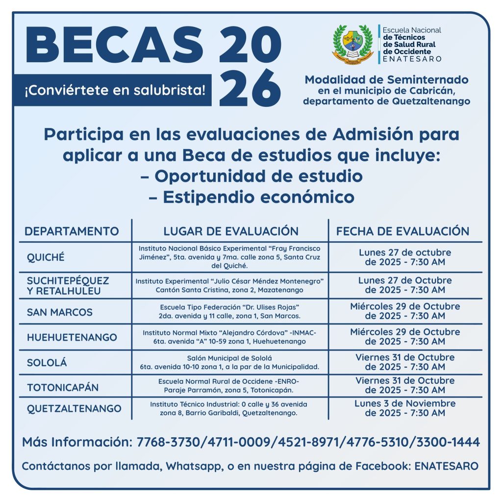 Para el año 2026, ENATESARO ofrece becas de estudio a jóvenes y señoritas mayores de edad que tengan la vocación para convertirse en salubristas al servicio de sus comunidades. La beca consiste en la oportunidad de estudio, y un estipendio económico que permite el pago de hospedaje y alimentación; puesto que la modalidad de la escuela es de seminternado, el estudiante se queda viviendo en el municipio de Cabricán, Quetzaltenango durante el tiempo que se forma en la escuela.